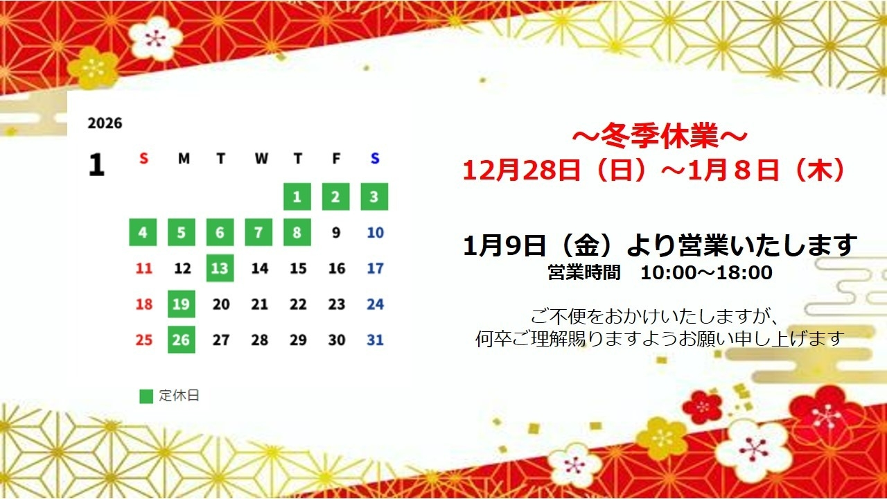 12月28日(日)~1月8日(木)まで冬季休業となります
