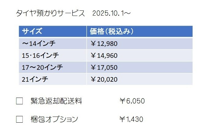 タイヤ預かりサービス、タイヤ交換料金のご案内