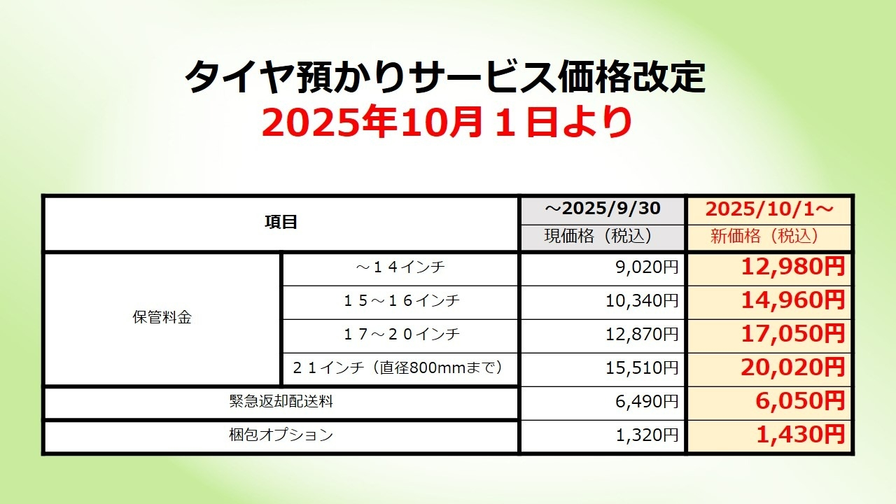 『タイヤ預かりサービス』の価格を改定させていただくこととなりましたのでご案内いたします