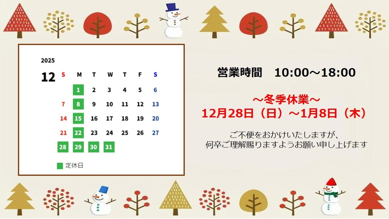 12月28日(日)~1月8日(木)は冬季休業とさせていただきます
