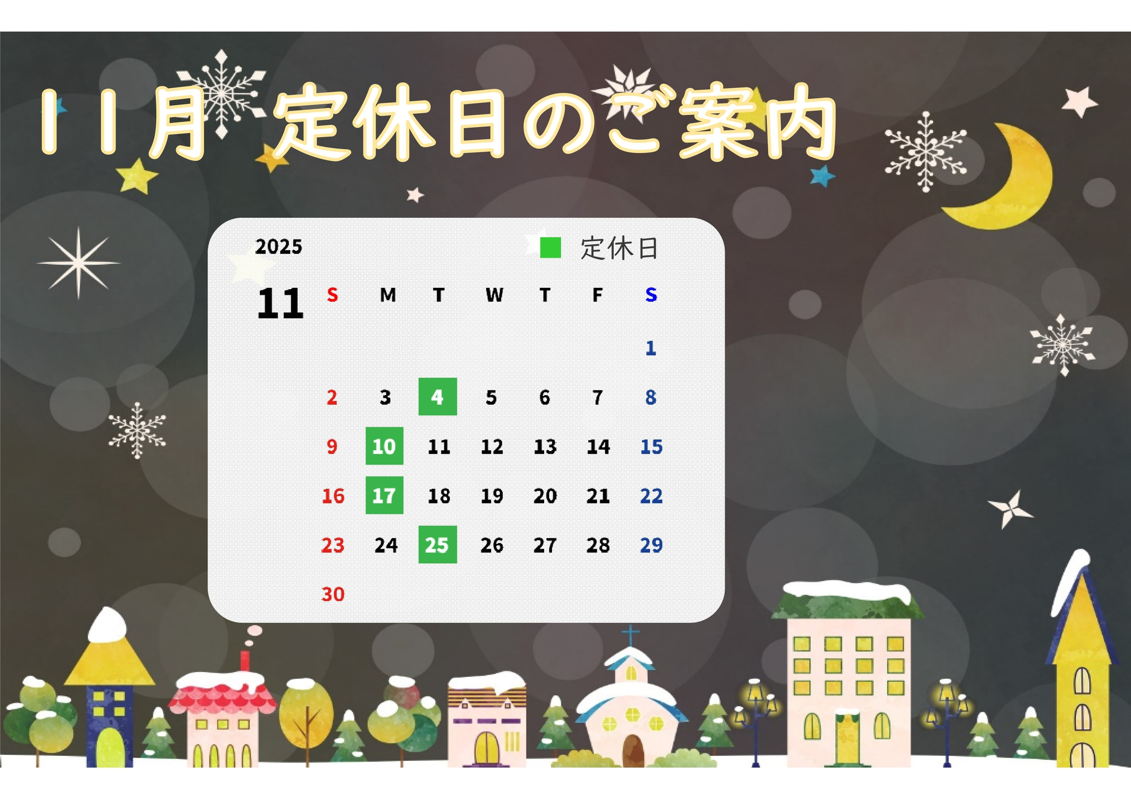 毎週月曜日を定休日としておりますが、11月は3日、24日が祝日の為営業日とし、翌火曜日がお休みとなります。11月のお休みは写真の通りです。