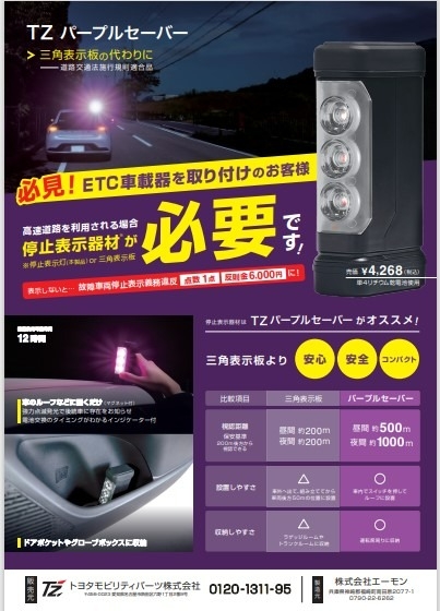 高速道路をご利用する場合、停止表示器材(停止表示灯または三角表示板)が必要となります。