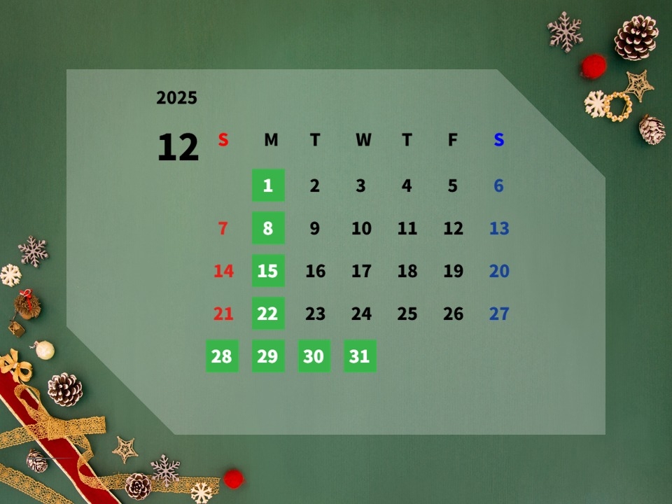 12月28日(日)~1月8日(木)までお休みをいただき、