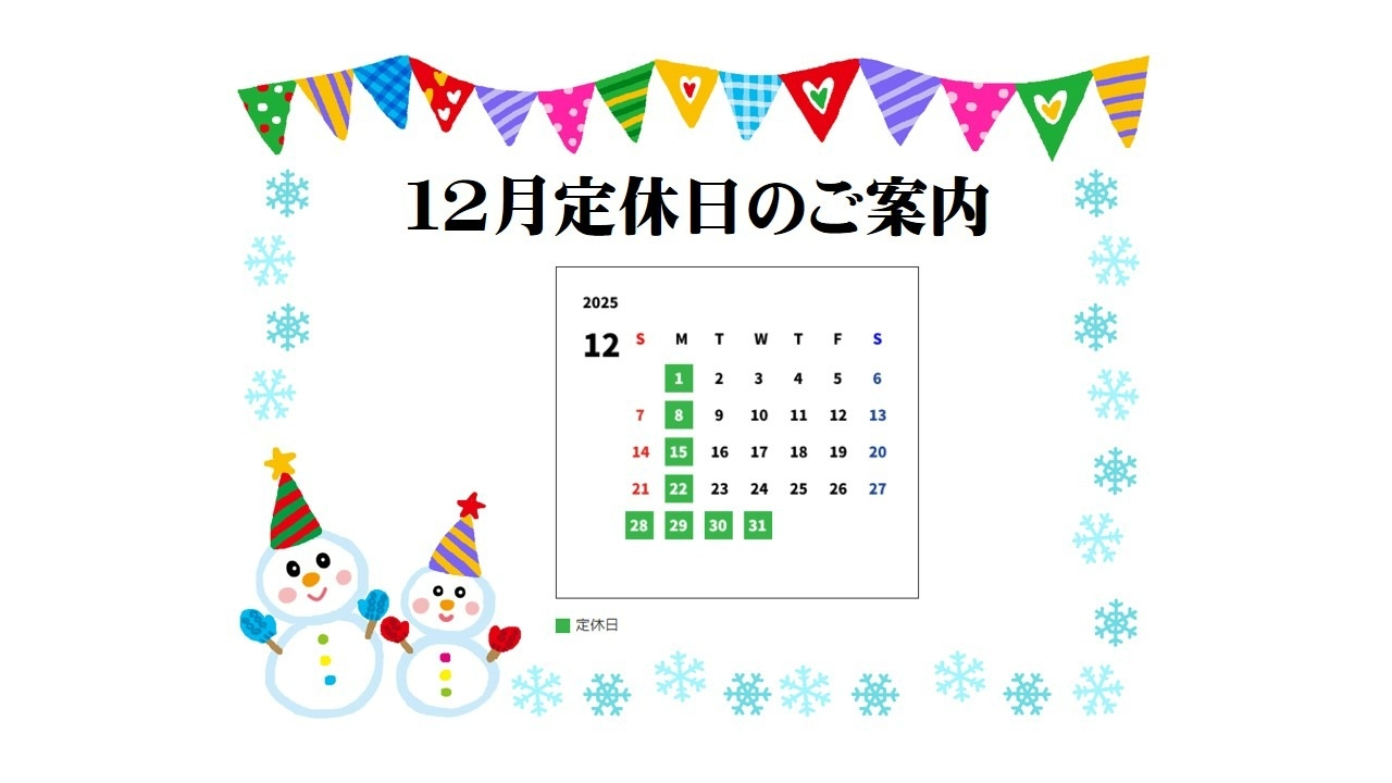 年末年始のお休みにつきましては、12月28日(日)~1月8日(木)でございます。