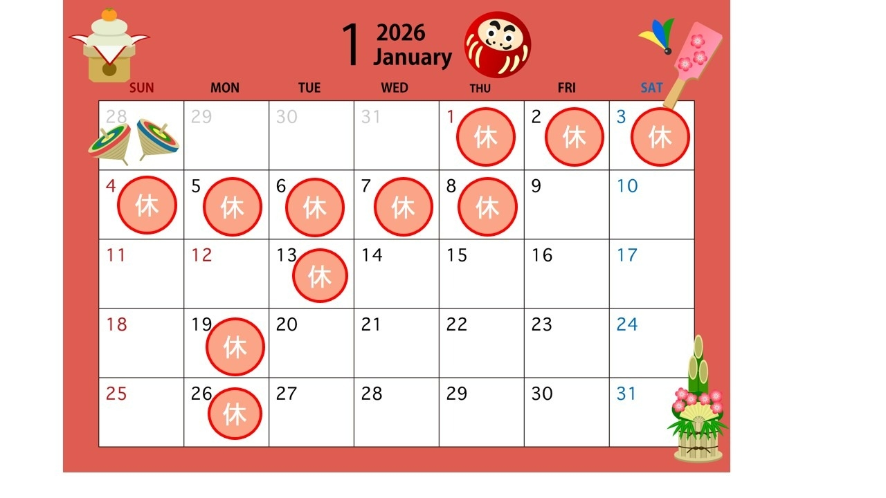 1月定休日 2026.01.12 ~1月の定休日のお知らせ~ 1月12日月曜日(成人の日)は営業しております。 翌日13日火曜日は定休日となりますので お気を付けくださいませ。 前の記事へ 店舗ブログ一覧に戻る 次の記事へ