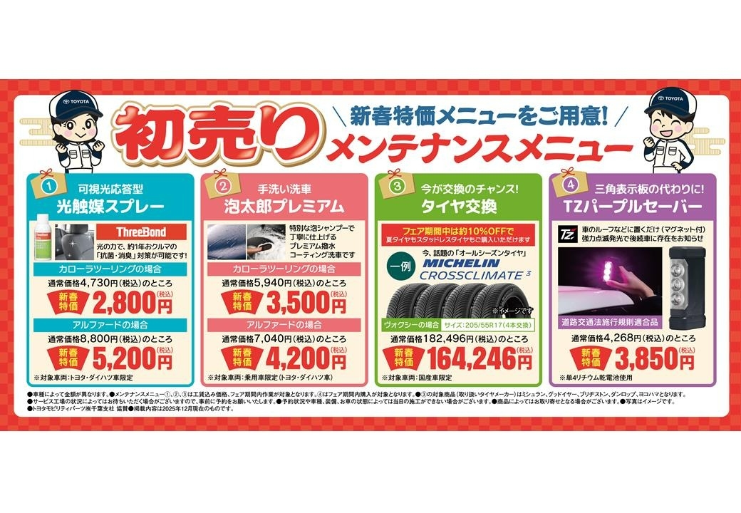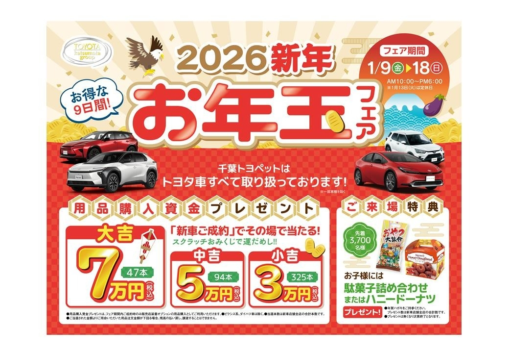 【千葉トヨペット】お年玉フェア開催中です 2026.01.10 お年玉フェア 千葉トヨペット 習志野店 こんにちは! 習志野店です★ 改めまして 本年もよろしくお願いいたします。 千葉トヨペットでは 1月12日(月)まで 新年お年玉フェアを開催しております。 お車のご購入を検討されている方は今がチャンス! お得なメンテナンスメニューも多数ご用意しております。 ぜひこの機会をご利用くださいませ。 皆さまのご来店お待ちしております。 前の記事へ 店舗ブログ一覧に戻る 次の記事へ