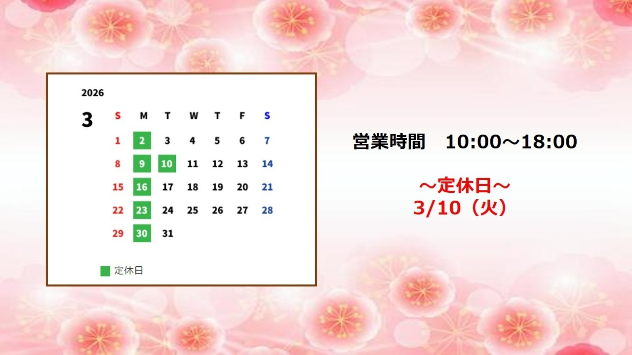 3月より第二火曜日(祝日、12月を除く)も定休日となります
