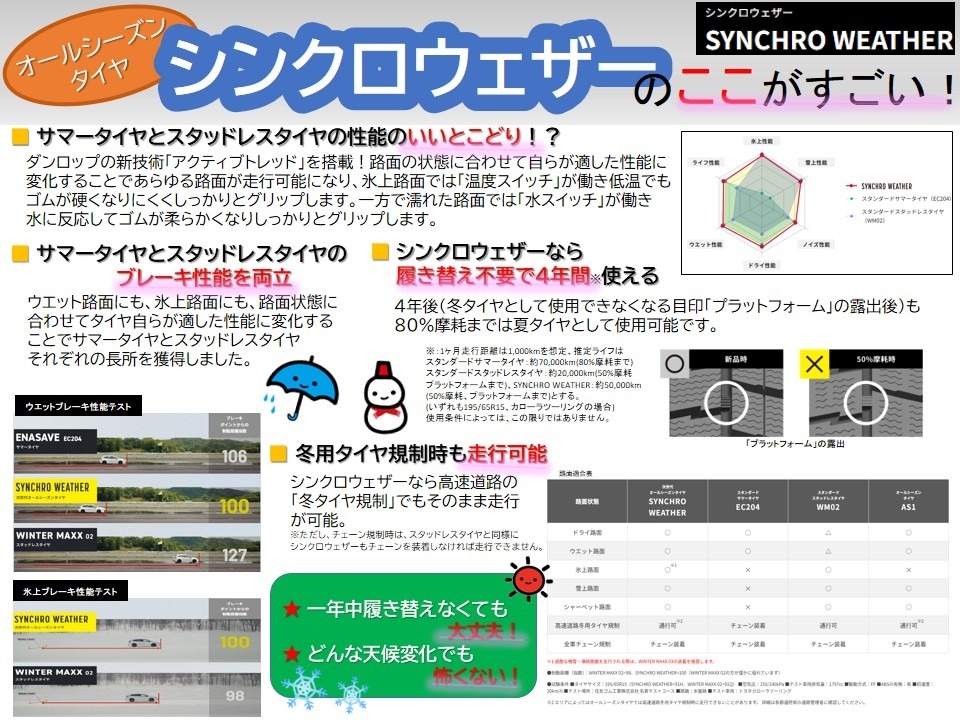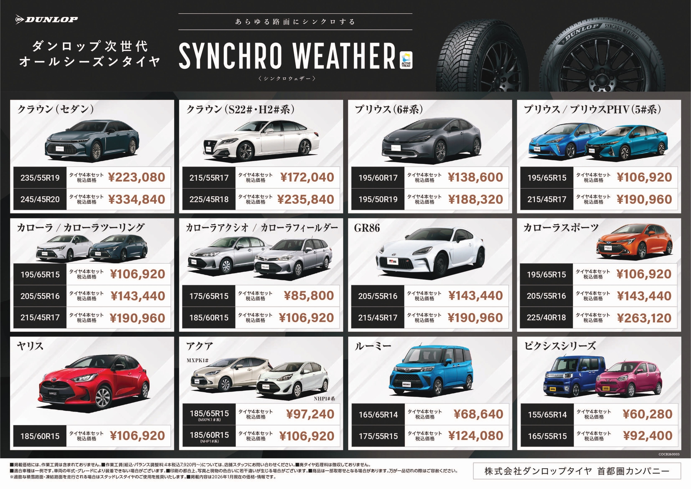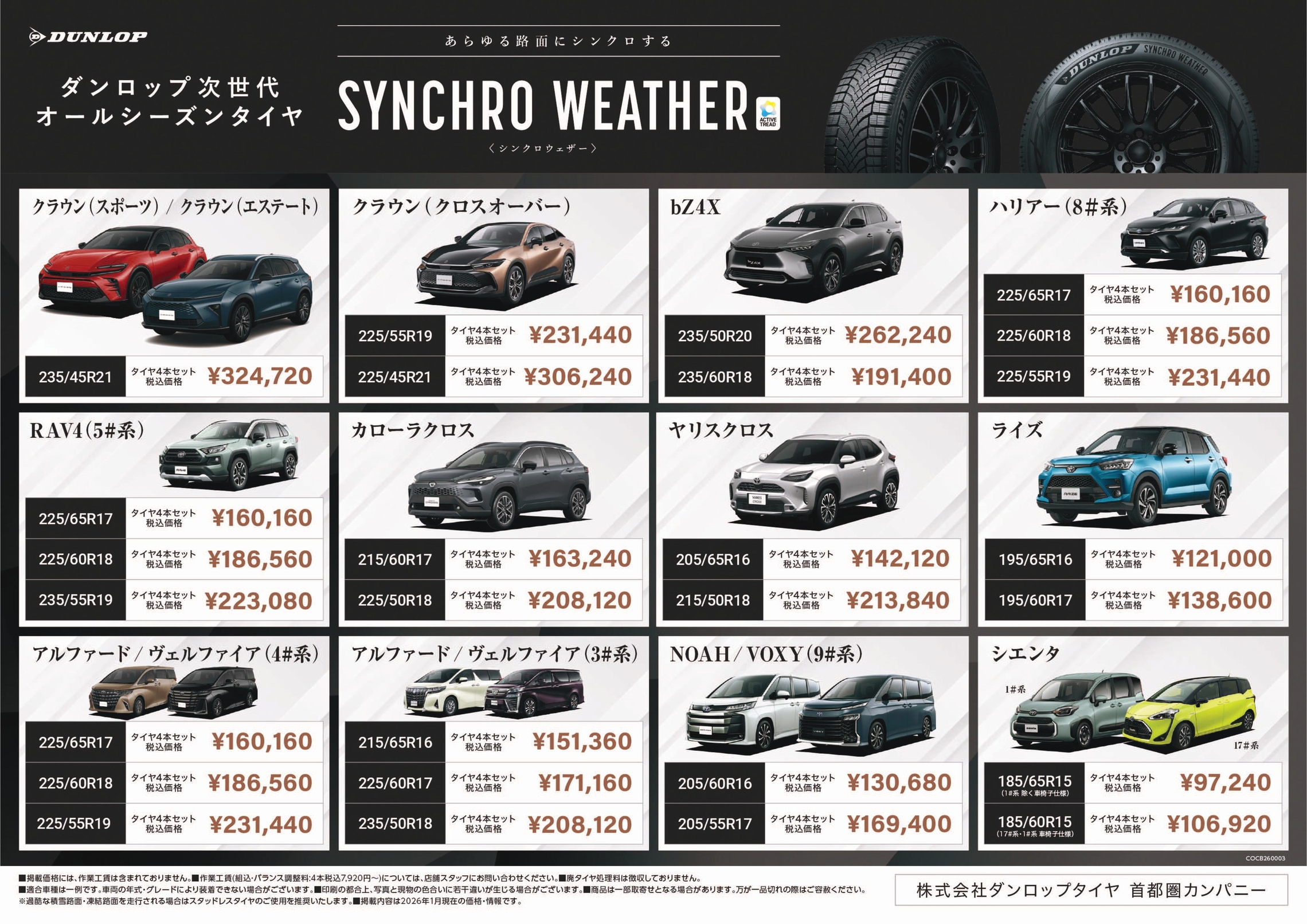 オールシーズンタイヤならコレ!! 2026.02.06 オールシーズンタイヤ オールシーズンタイヤってどうなの? と思っている方は必見です!! 特にダンロップのシンクロウェザーは進化しています✨ 夏も冬も、一年通して使い続けられて タイヤ付替えの手間や、保管場所にも困りません✨✨ 詳しくはこちらをクリック↓ ダンロップ シンクロウェザー ※取付工賃・チューブレスエアバルブ代は別途かかります。 前の記事へ 店舗ブログ一覧に戻る 次の記事へ