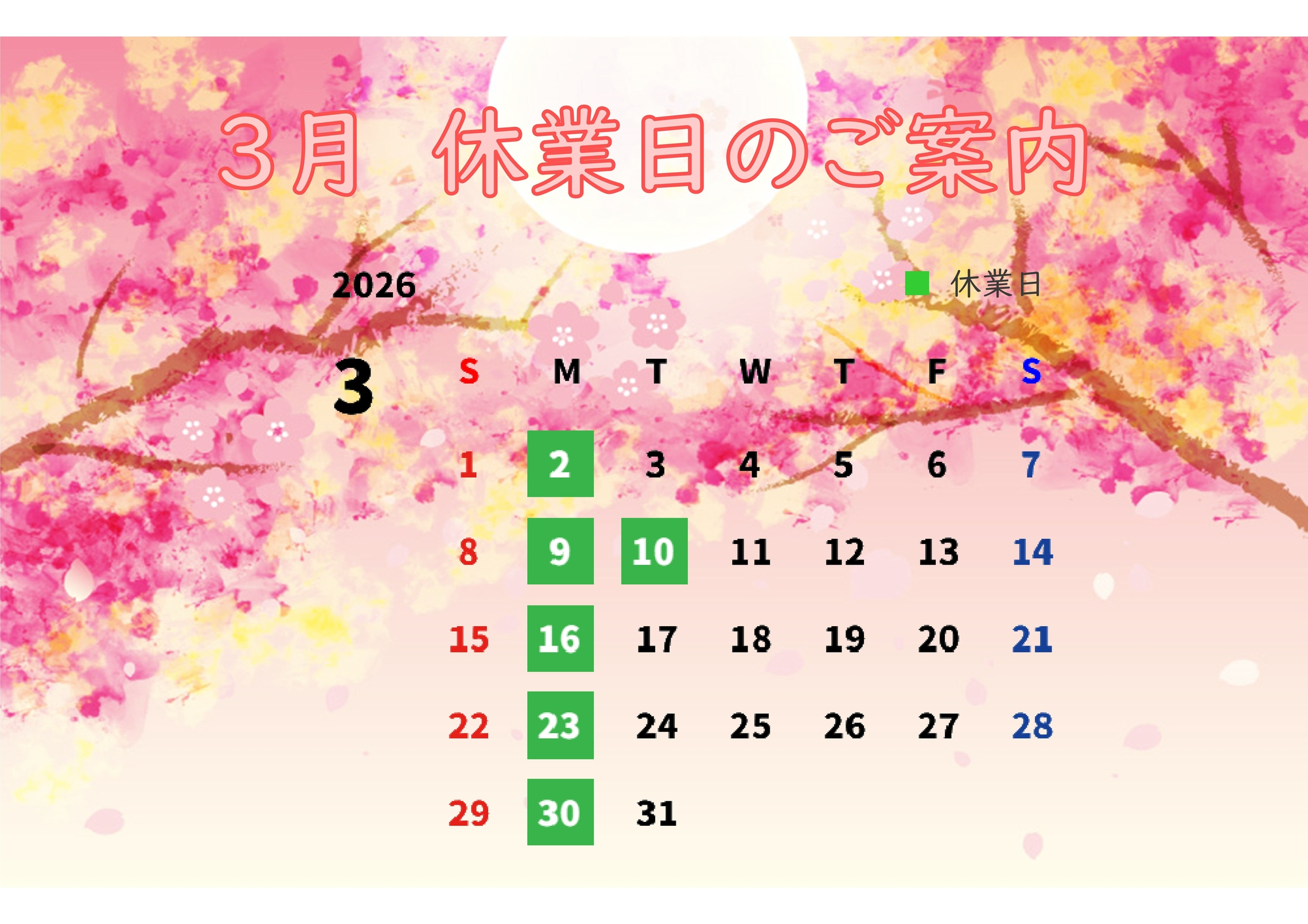 3月の休業日は画像のとおりとなります。