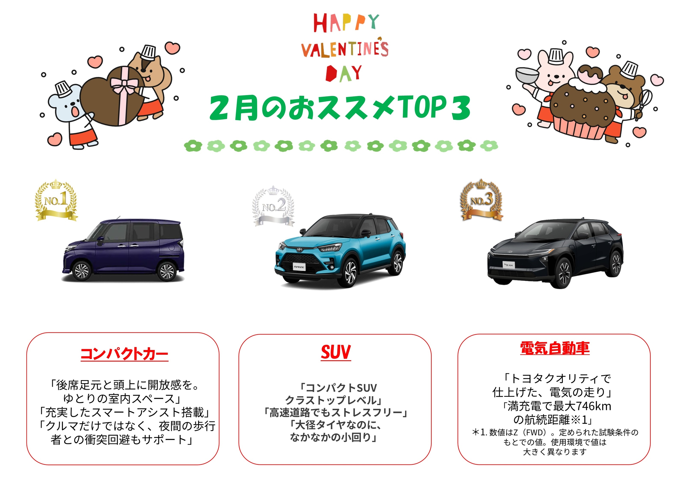 🍫・・2月おすすめ車種紹介・・🍫 2026.02.06 こんにちは🧸 千葉トヨペット八街店です 今月のTOP3 八街店に試乗車が揃っております♡🚙♡ ぜひ、整備のお待ちの間でもお気軽にお声掛けください。 前の記事へ 店舗ブログ一覧に戻る 次の記事へ