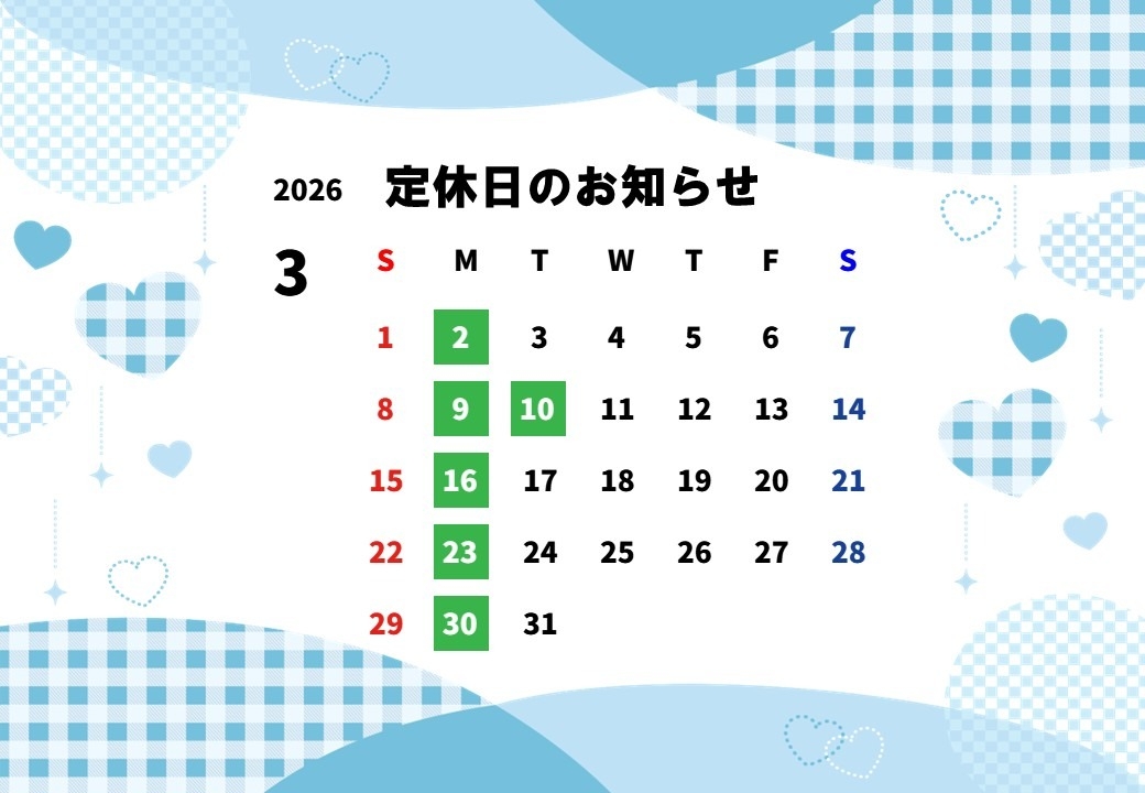 3月の定休日をお知らせいたします。