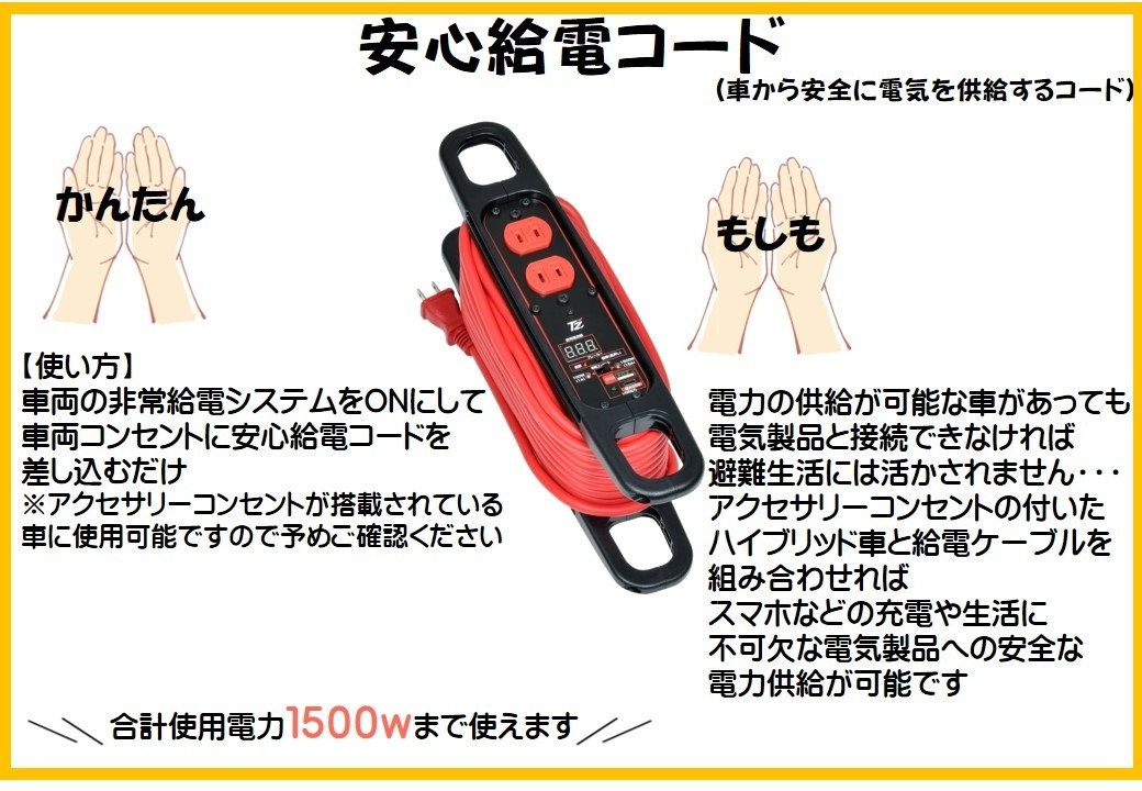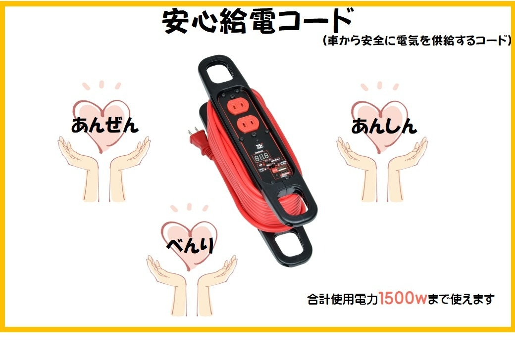 アクセサリーコンセント搭載車と安心給電コードを組み合わせれば