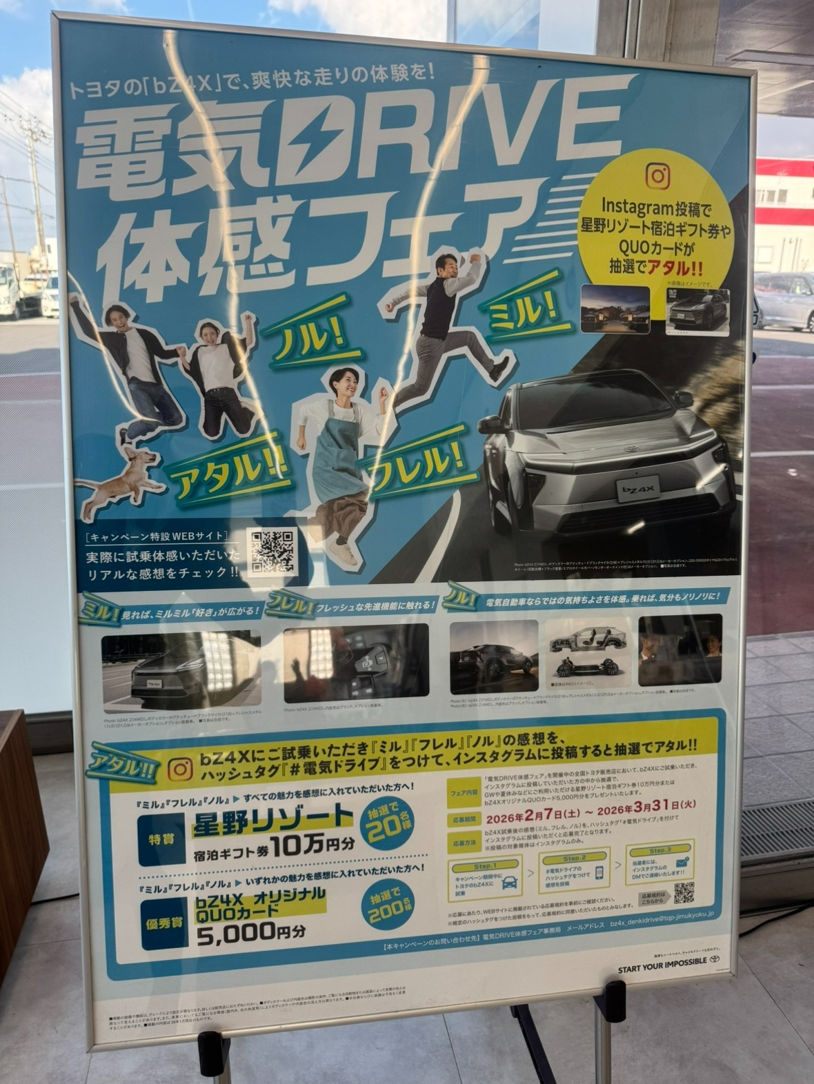 bZ4Xにご試乗いただき『ミル』『フレル』『ノル』の感想を、ハッシュタグ『♯電気ドライブ』をつけて