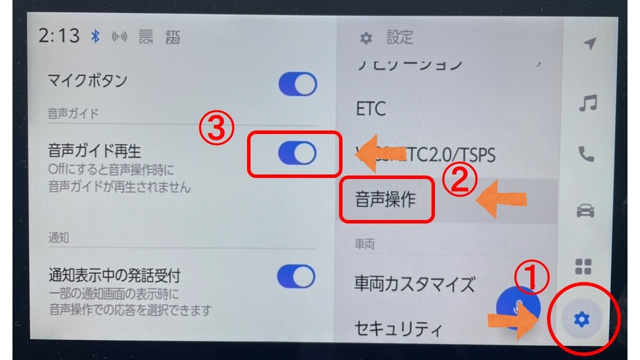 上記画像の①のマークをタップ→②「音声操作」→③「音声ガイド再生」をOFFにすると