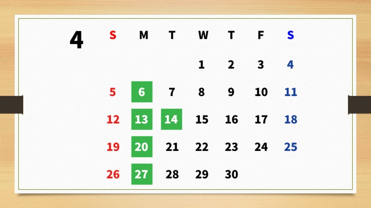 4月の定休日 2026.04.01 こんにちは!千葉トヨペット市原店です! 4月の定休日をご案内いたします! ■が定休日です 4月もたくさんのご来店をお待ちしております! 前の記事へ 店舗ブログ一覧に戻る 次の記事へ