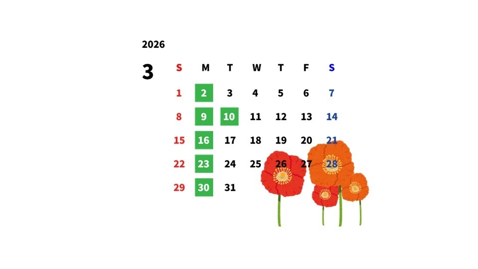 \\3月9日と10日は定休日です// 2026.03.08 定休日 千葉トヨペット東金店 千葉トヨペット トヨタディーラー いつもブログをご覧いただきありがとうございます🌸 明日3月9日月曜日 明後日3月10日火曜日は 連休となります。 緑色の日が定休日です。 よろしくお願いいたします。 前の記事へ 店舗ブログ一覧に戻る 次の記事へ