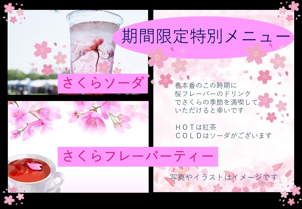 ほのかにピンク色の桜の香りのソーダをぜひご賞味くださいませ。