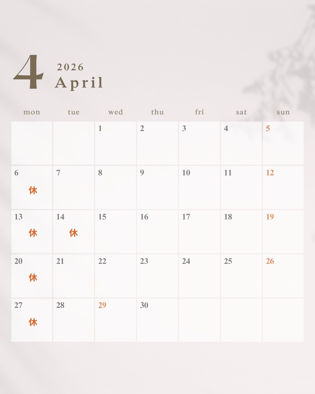 4月は毎週月曜日と14日火曜日をお休みとさせていただきます。