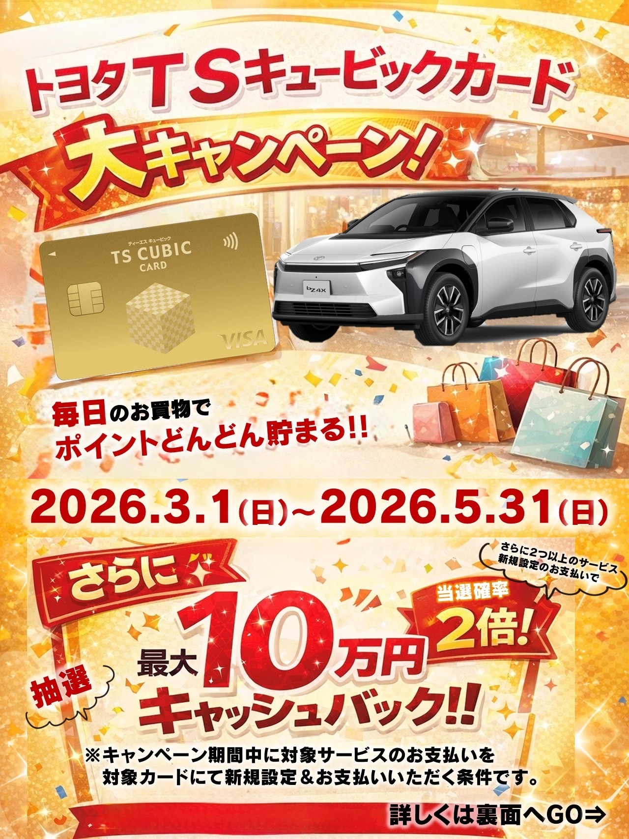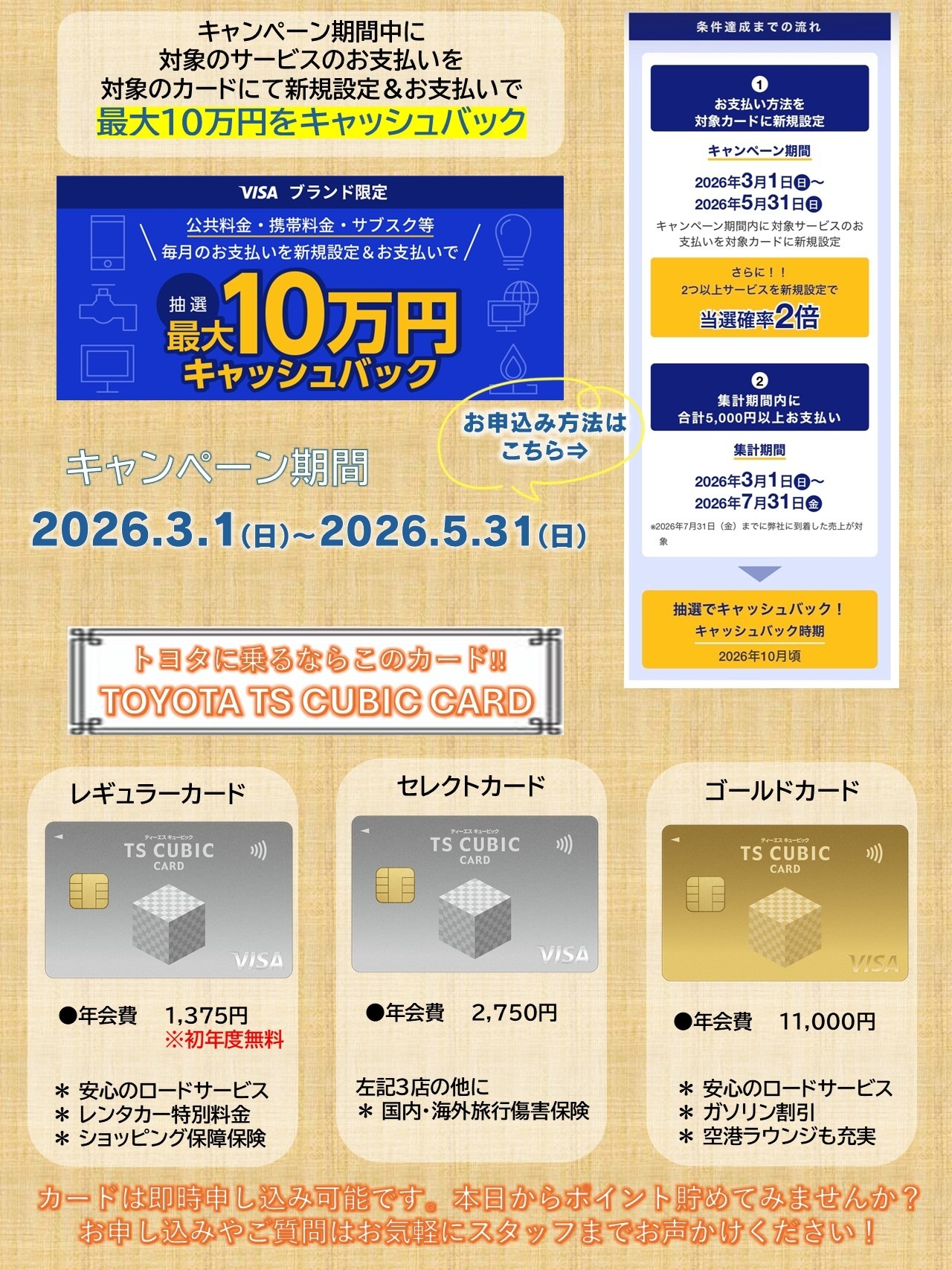 現在、TSキュービックカード《VISAブランド限定》にて抽選で最大10万円キャッシュバック中です(#^^#)